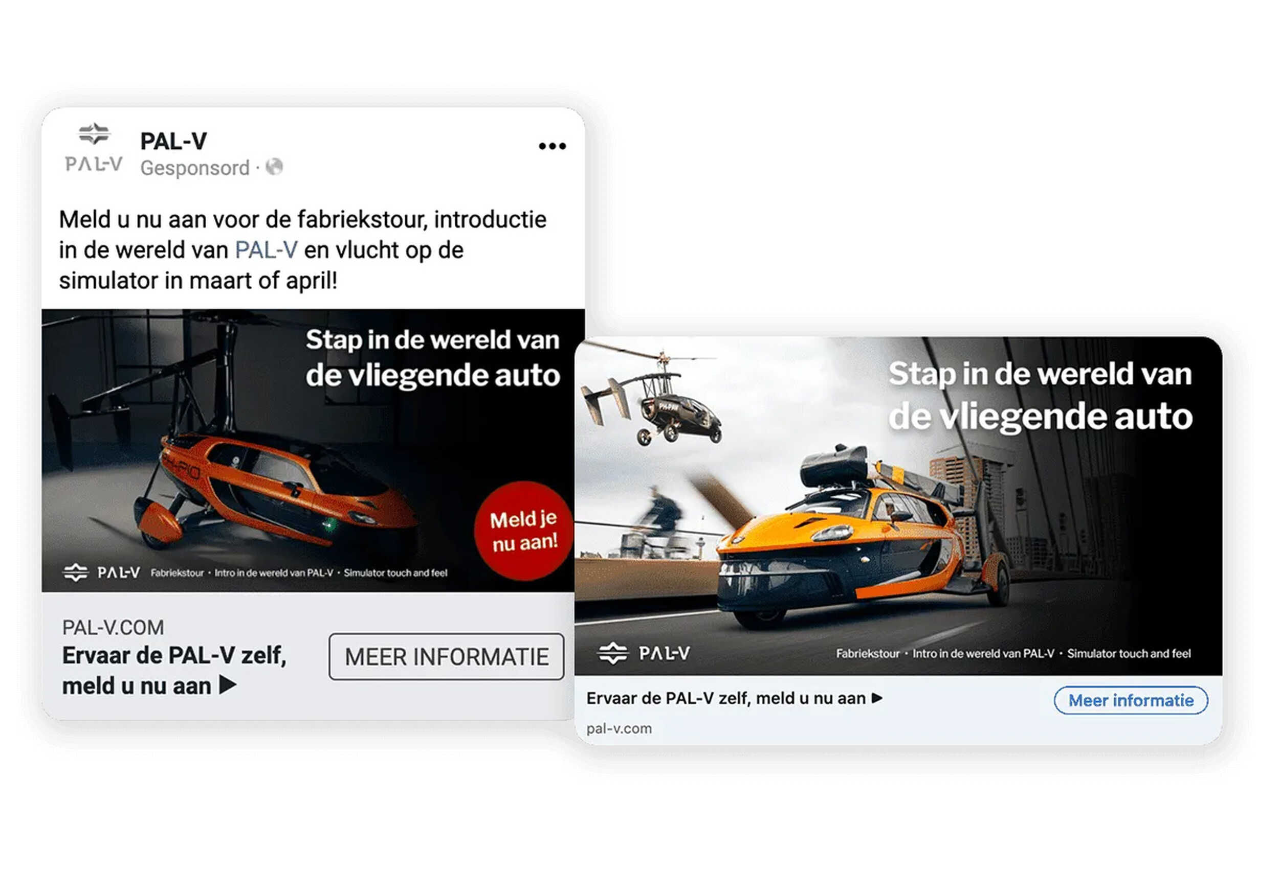 PAL-V, de eerste vliegende auto ter wereld, is in een vergevorderd stadium. Ben jij klaar voor het volgende avontuur? Geïnteresseerden kunnen zich namelijk nu aanmelden voor de volledige experience op het hoofdkantoor in Raamsdonksveer. Maar hoe genereer je eigenlijk aanmeldingen voor een high-end product met een zeer specifieke doelgroep? Wij zetten succesvolle campagnes in op Facebook, Instagram en LinkedIn voor PAL-V om deze zeer specifieke doelgroep te bereiken via social media!